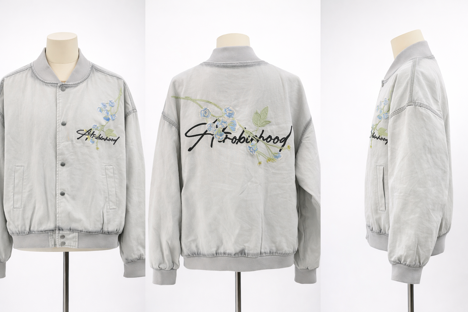 Embroidered Floral Bomber Baggy Shirt– Grey