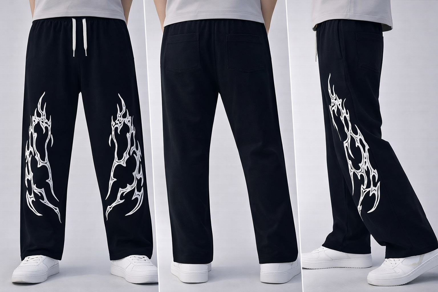 The highlight is the striking white graphic print running along both legs, adding a sharp, edgy aesthetic without overpowering the clean silhouette. An elasticated waistband with adjustable drawstring ensures a secure yet comfortable fit, perfect for everyday wear.