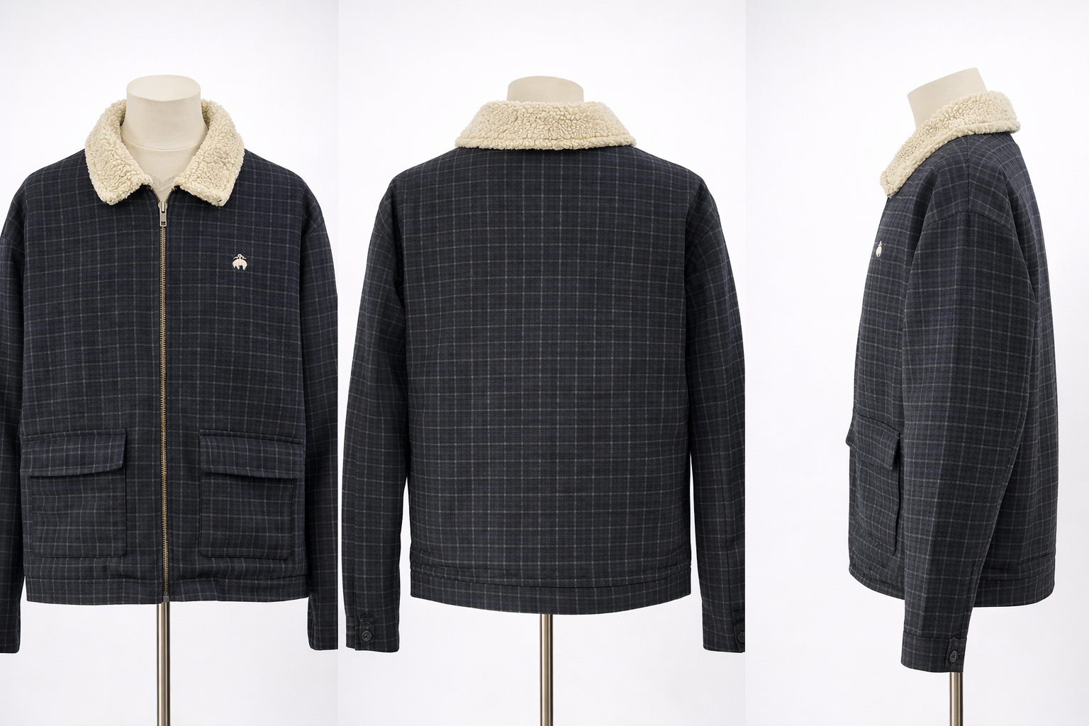 The subtle grid check pattern keeps the look clean and versatile, while the front zip closure and functional flap pockets add practicality. Finished with a minimal embroidered logo on the chest, this jacket blends modern streetwear with classic outerwear appeal.